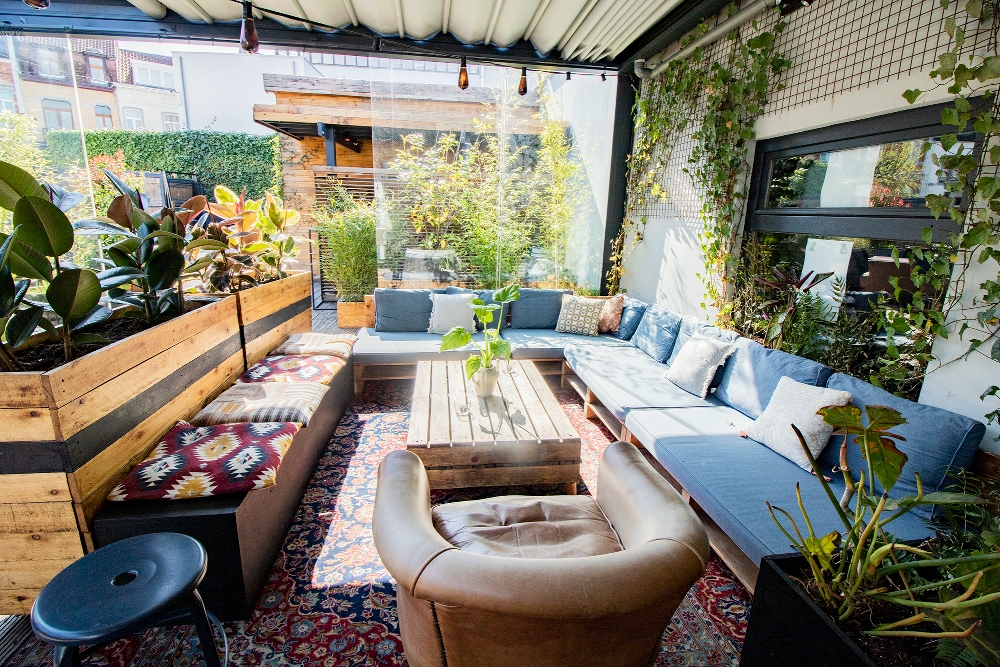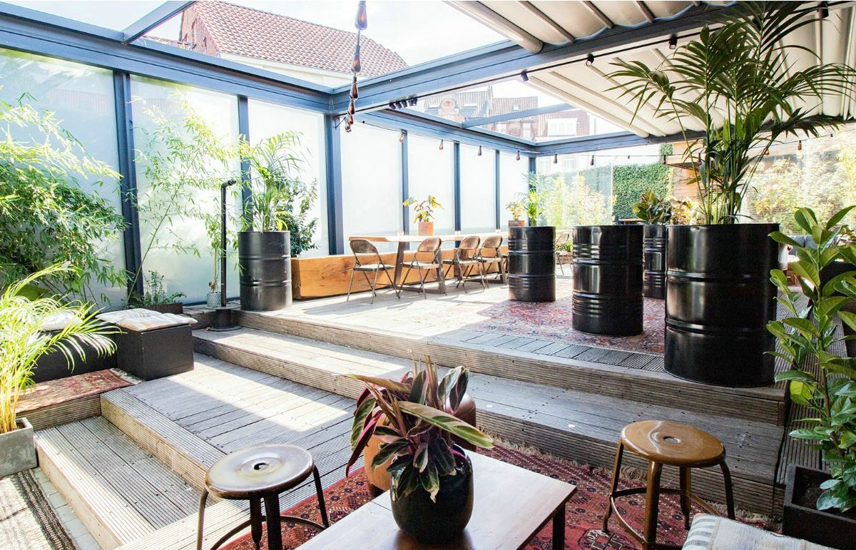 La décoration et le mobilier sont principalement réalisés en bois, avec de nombreuses touches de verdure et des matériaux naturels. L'atmosphère est tamisée et intime, rehaussée par des tapis, des coussins dépareillés et des guirlandes lumineuses.